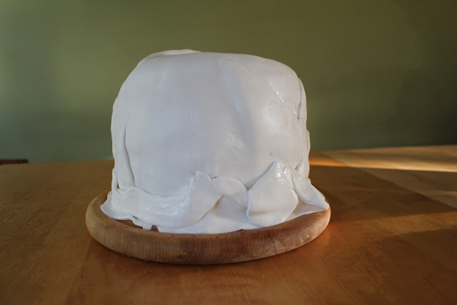 Once the cakes were cooled, I stacked them together with butter cream and jam, then covered the whole thing in dark chocolate ganache made by bringing 21 fl oz cream to the boil and mixing in 2 lbs 10oz of dark chocolate. This will make plenty to cover the cake and probably give you some left over to eat off the spoon...! The reason for using the ganache is that it gives a really good, smooth finish for any decorating you want to do. You should leave it overnight to cool, or put it in the freezer. There are some tutorials on Youtube if you need more help.